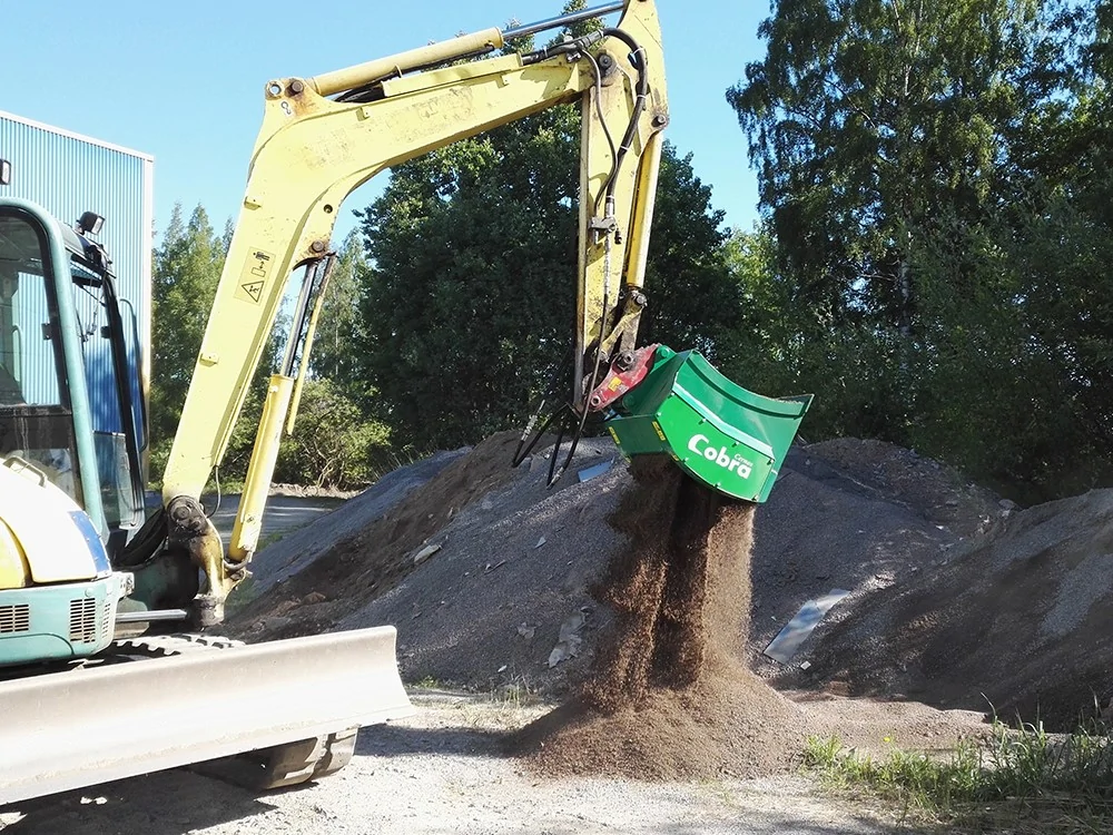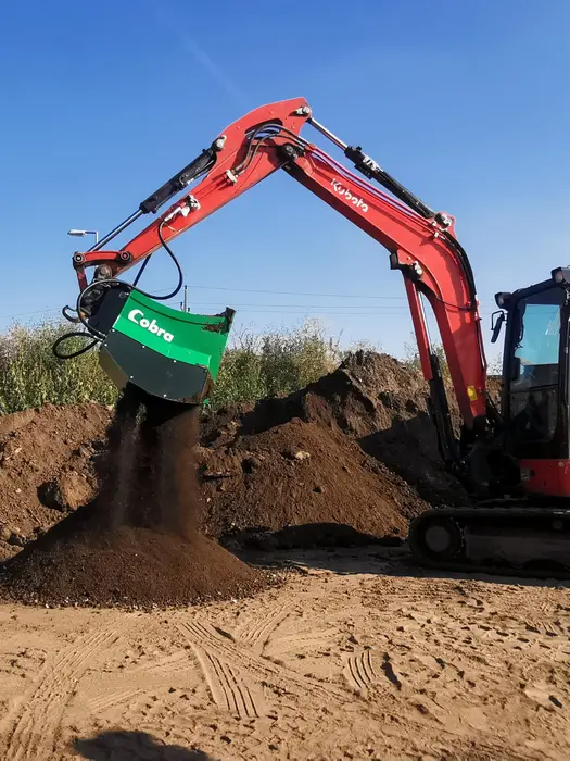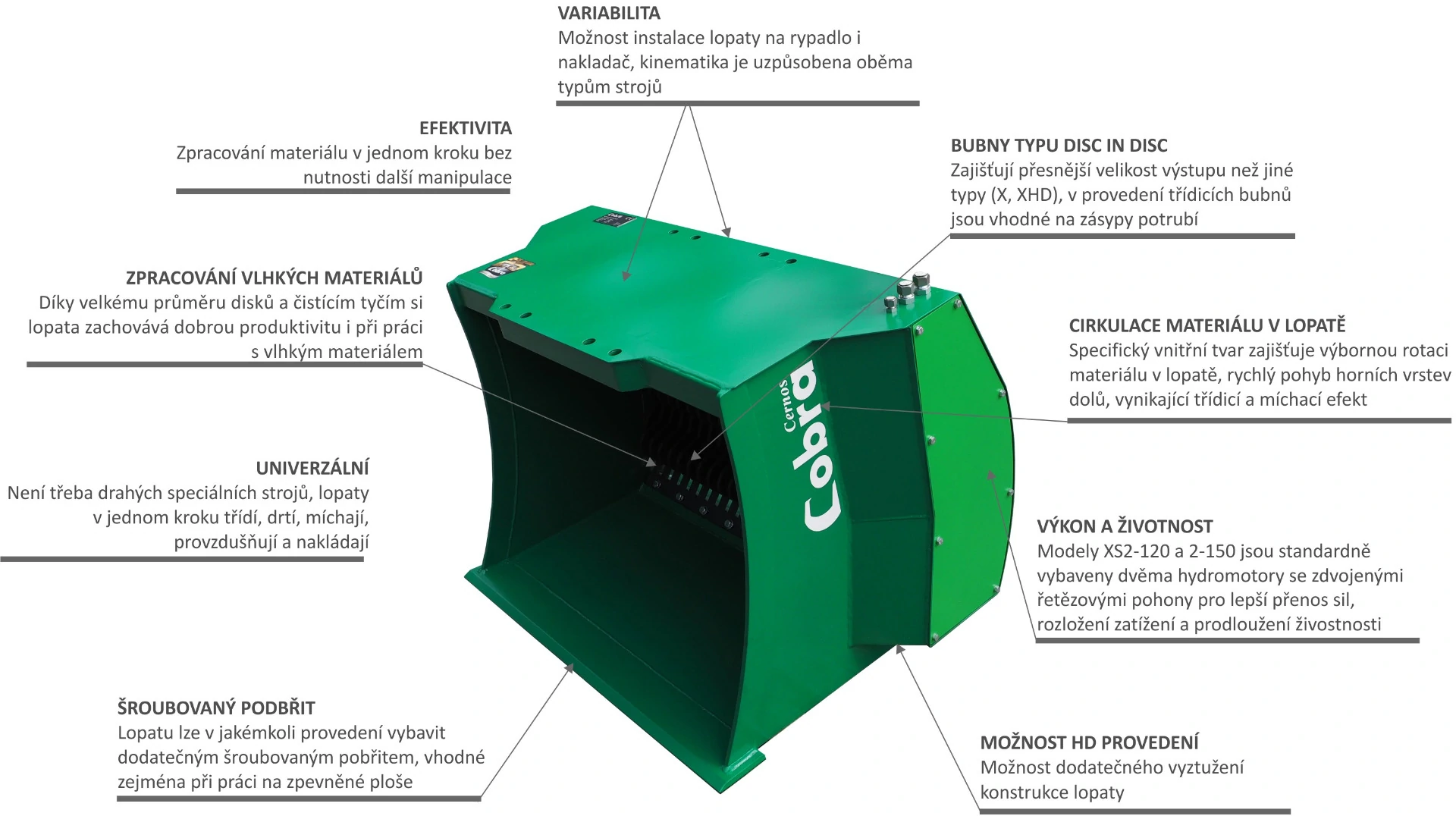 Třídící lopaty Cobra se používají na nakladačích a rypadlech, umožňují třídit, prosévat, drtit, míchat a provzdušňovat různé vstupní materiály včetně mokrých a lepivých a vytvořit z nich materiál vhodný k dalšímu využití. Nejmenší řada třídicích lopat je vhodná zejména pro lehké aplikace (třídění a drcení zeminy, úprava kompostu atd.) Široká nabídka lopat Cobra umožní najít vhodný typ třídicí lopaty pro zpracování nejrůznějších materiálů a pro připojení na všechny běžné typy strojů. Připojením třídicí lžíce získáte účinné třídicí a drticí zařízení bez nutnosti investovat do drahých speciálních strojů. Třídicí lopaty jsou mobilní zařízení a tedy zpracování materiálu probíhá přímo v místě bez nutnosti jeho přepravy.